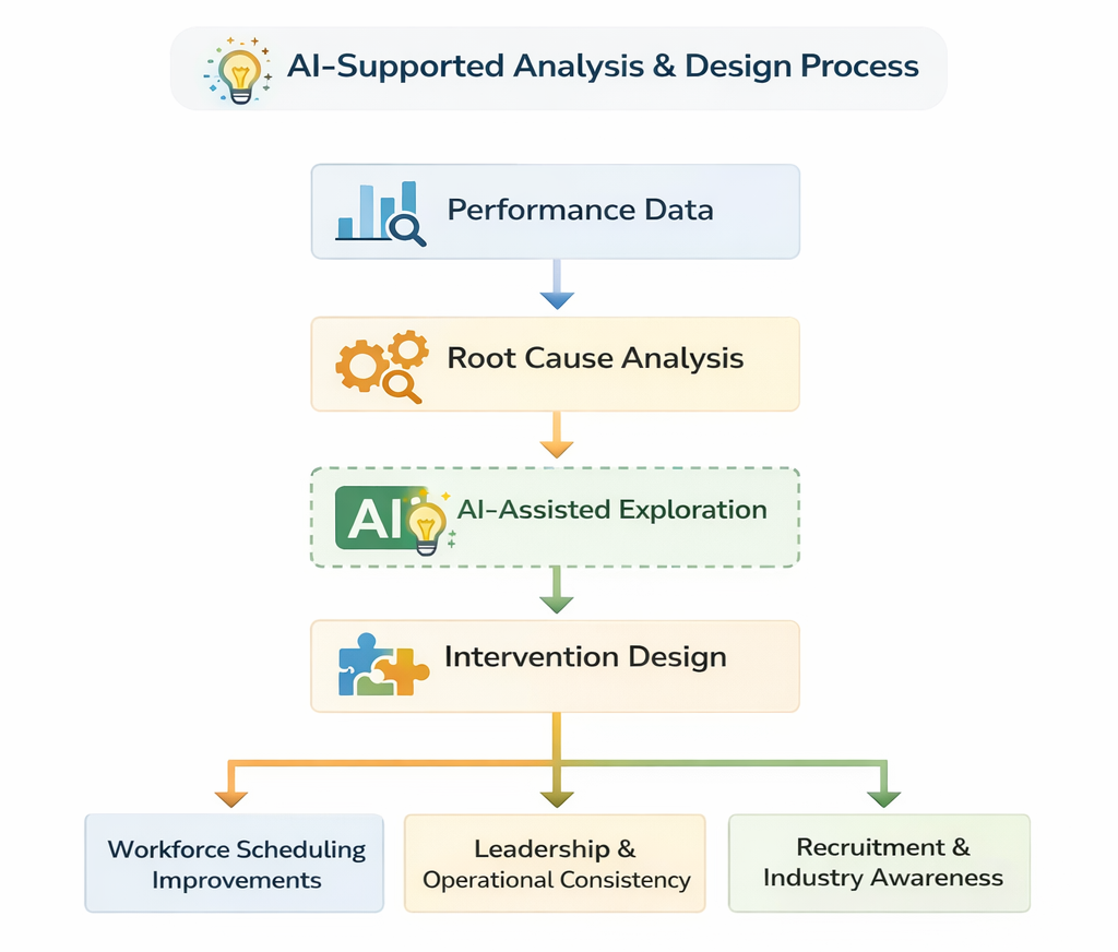 Based on the performance analysis, a set of targeted interventions was designed to address the identified root causes while supporting long-term workforce stability and operational consistency.