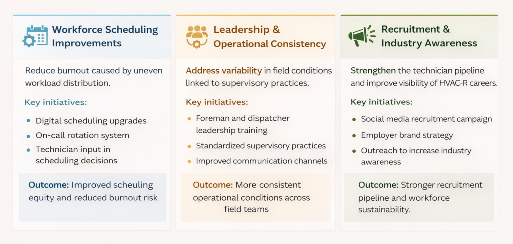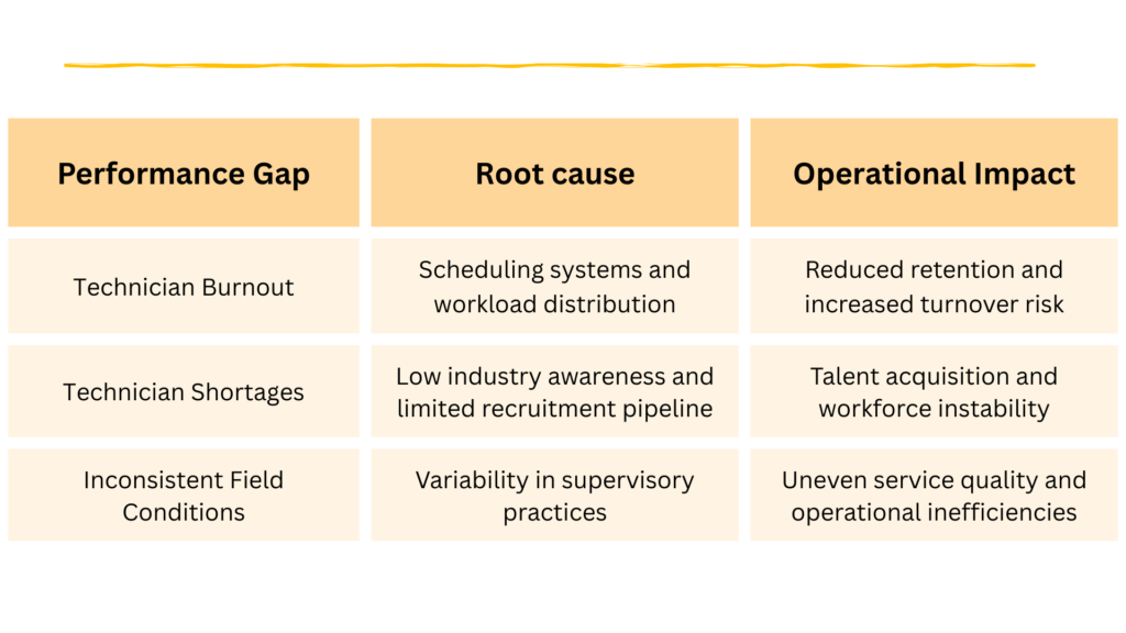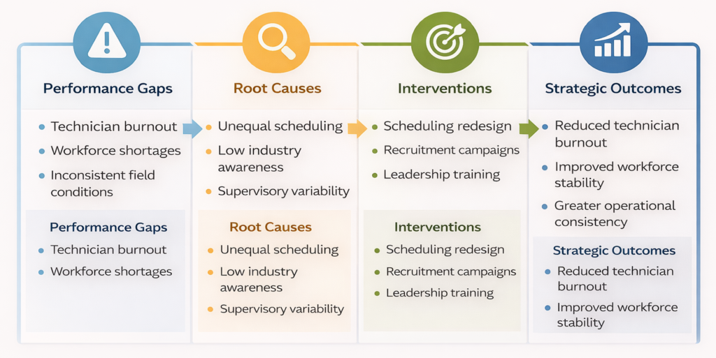 A systems-based performance improvement initiative addressing technician burnout, workforce shortages, and supervisory inconsistency within a national commercial refrigeration organization. The analysis combined Human Performance Technology (HPT), root cause investigation, technician survey data, and AI-supported exploration of qualitative observations to design targeted, multi-level interventions supporting workforce sustainability.