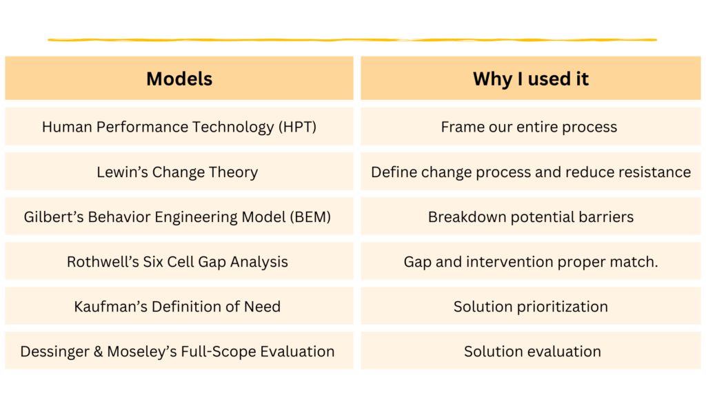The diagnostic and intervention design process was guided by established performance improvement frameworks to ensure that identified gaps were analyzed systematically and that proposed solutions addressed root causes rather than symptoms.